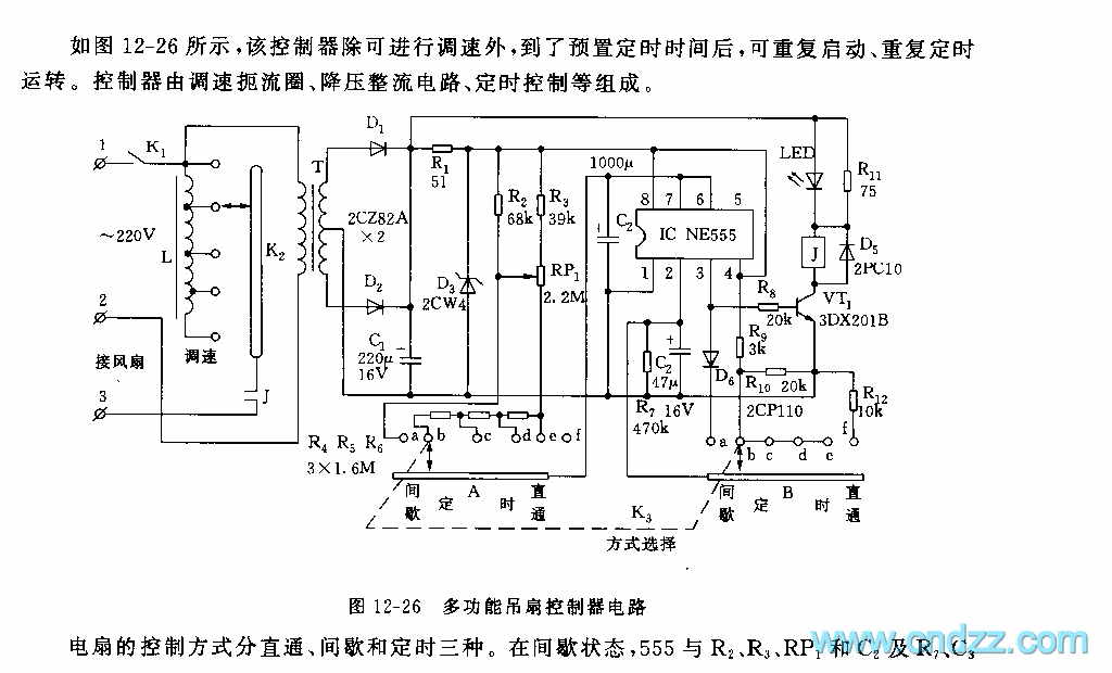 The fan control method is classified into three ways that are direct, interval and timing. In the interval state, 555,R2,R3,RP1,C2,R7,C3 and so on consists a non-steady multi-resonate oscillator, before the charging voltage reaches the trigger LEV(2/3VDD), the 3-pin of 555 is in a high LEV, VT1 is conducting, the relay J pulls in, the fan gets power and starts to run, the running time is determined by R2,R3,RP1 and C2, in the figure, the corresponding time to the parameters is around 25~60s. The interval time means the period after 555 is reset, and C2 discharges(with the help of R7) to the the trigger LEV of 2-pin(1/3VDD), the time span corresponding to the parameter in the figure is about 20s.
