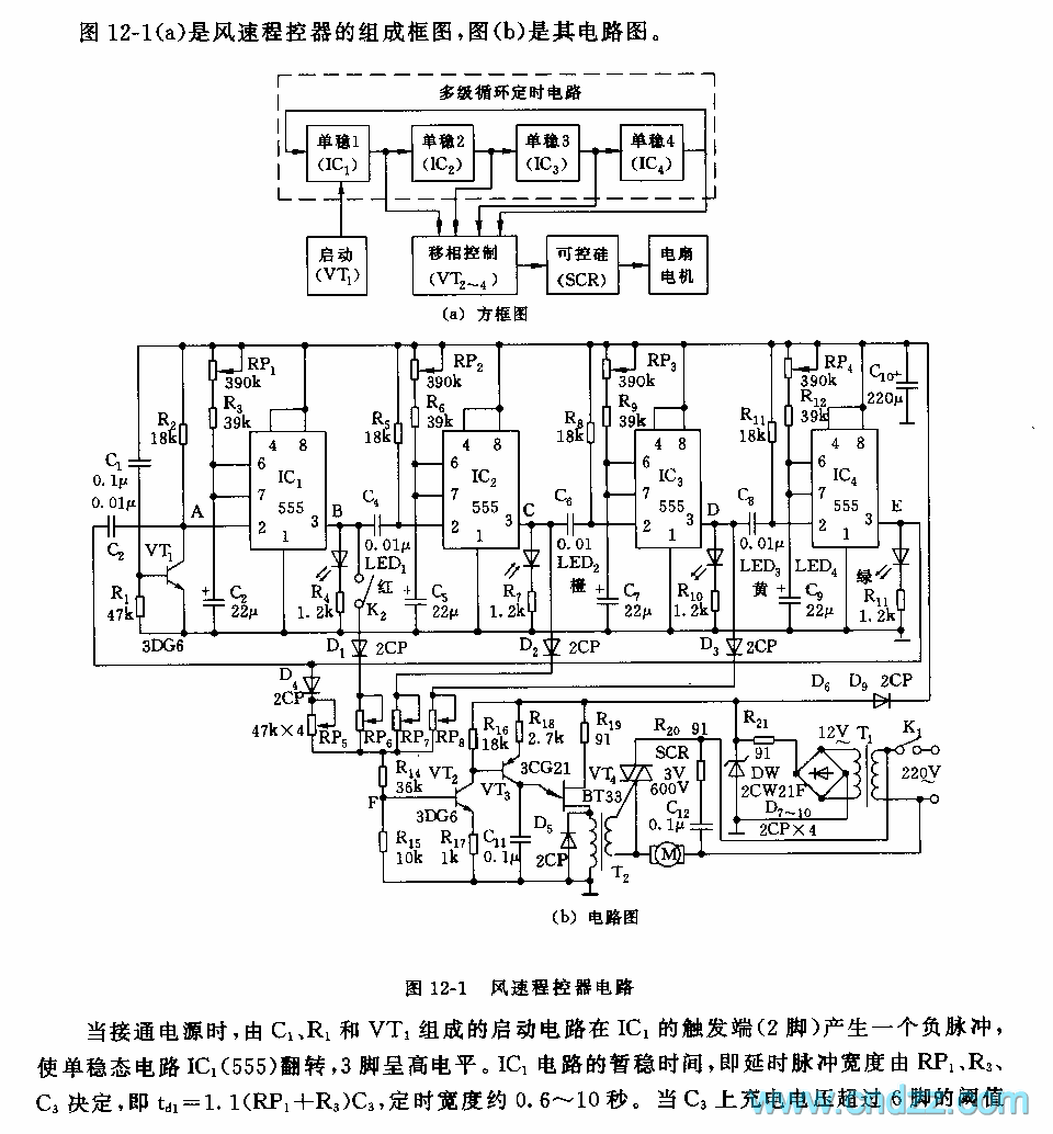 Figure 12-1(a) is a combination circuit of wind speed controller, and (b) is a another circuitWhen the power is getting through, the starting circuit consisting of C1, R1 and VT1 generates a negative pulse on the trigger terminal(2-lead) of IC1, which reverses the single steady circuit of IC1(555), and the 3-lead is in a high LEV. The temporarily steady time of IC1, i.e the pulse width of time delay, is decided by RP1,R2 and C3, i.e td=1.1(RP1+R3)C3, the timing width is about 0.6~10s. When the charging voltage on C3 is higher than the 6-pin threshold value LEV of 2/3VDD, the trigger is reset, and 3-pin is in a low LEV.
