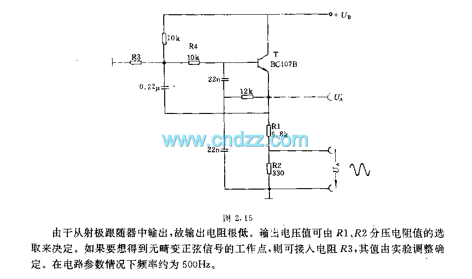 As it is output from the emitter follower, the output resistance is very low. Output voltage can be decided by R1, R2 piezoelectric resistance. If you want to get sinusoidal signal without distortion, you can access resistor R3, its value is determined by the test adjustment. In the case of parameters, the frequency of the circuit is about 500Hz.