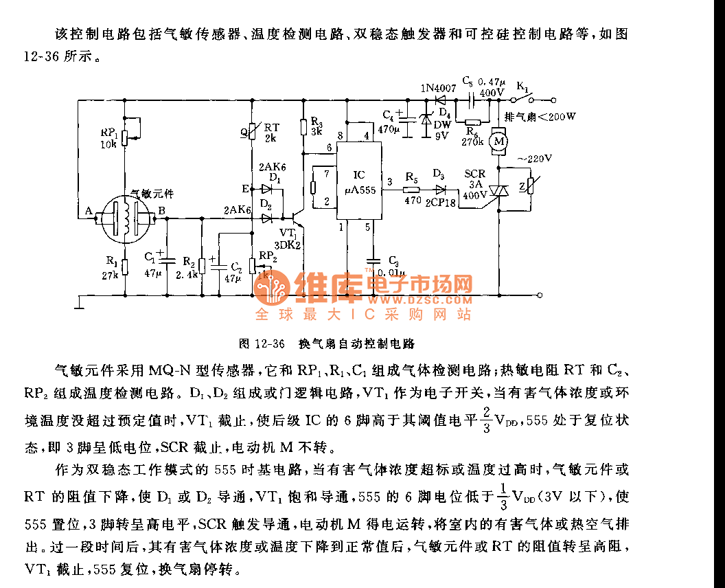 Figure 12-36 The auto-control circuit of ventilators The gas-sensitive element is fixed with MQ-N sensor, whichforms the gas detection circuit with RP1,R1 and C1; the thermistor of RT, C2 and RP3 form the temperature detection circuit. D1 and D2 form the logic circuit, VT1 is the e-switch, when the harmful gas content or the interior temperature is in the range of regulated values, VT1 is cut off and the 6-lead of the backward IC is in a 2/3VDD LEV, 555 is in a reset state,i.e 3-lead is in a low LEV, SCR is blocked and the motor M is still.
