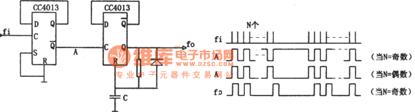 In the figure is the continual signal frequency splitting circuit composes of CC4013. This circuit consists of a double frequency splitter circuit and a single steady circuit, which can fulfill the splitting function with external signals, but when the input signal is halt, the circuit can come back to the 0 state automatically. The single steady time can be adjusted according to requirements. The input signal is in the terms of continual bundles. After it crosses the 1st stage frequency splitter, though the pulse in the bundle is split, the interval between bundles may be in the low LEV (if the number of the pulse in the bundle is even).
