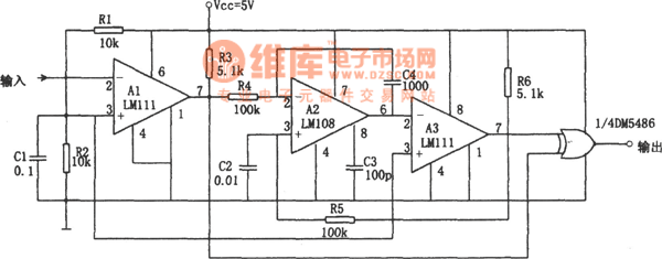 The circuit consists of the voltage comparator, Miller integrator and OR gate. A1 is the LEV comparator, which is fulfilled by the chip LM111, the chip forms the rectifier circuit that converts the long-rising-time waveform (such as the sine wave) to the short-rising-time square wave. The square wave output by A1 is turned into the triangular wave by the Miller integrator which consists of A2, R4 and C4, and then the LEV comparator A3 turns the triangular wave into the square wave. There is a 90⁰ phase difference between A1 and A3, so after crossing the the OR gate, the wave is doubled and then output.