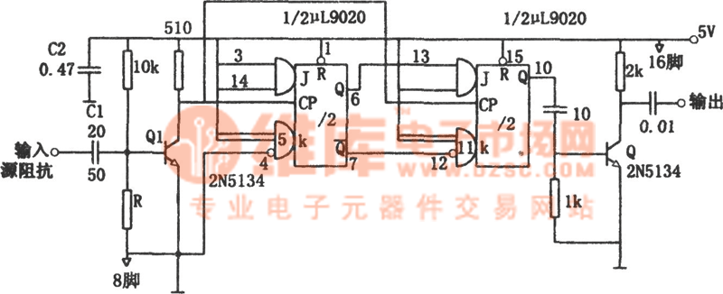 The figured splitter circuit is triggered when the peak value is in the range of 0.5~5v, no matter whether it is the sine wave or the square wave. The working frequency of the circuit is 40MHz. The input signal of the frequency splitter drives the J-K triggers after it has passed the amplitude limit amplifier Q1, finally, it crosses the buffer Q2 and is output. The transistor Q1 offers the first stage splitter a proper triggering LEV. When the high LEV drives, the capacitor C1 plays a part of current limitation. If the drive LEV is low, we can expand the volume of C1, the the trigger power is increased.