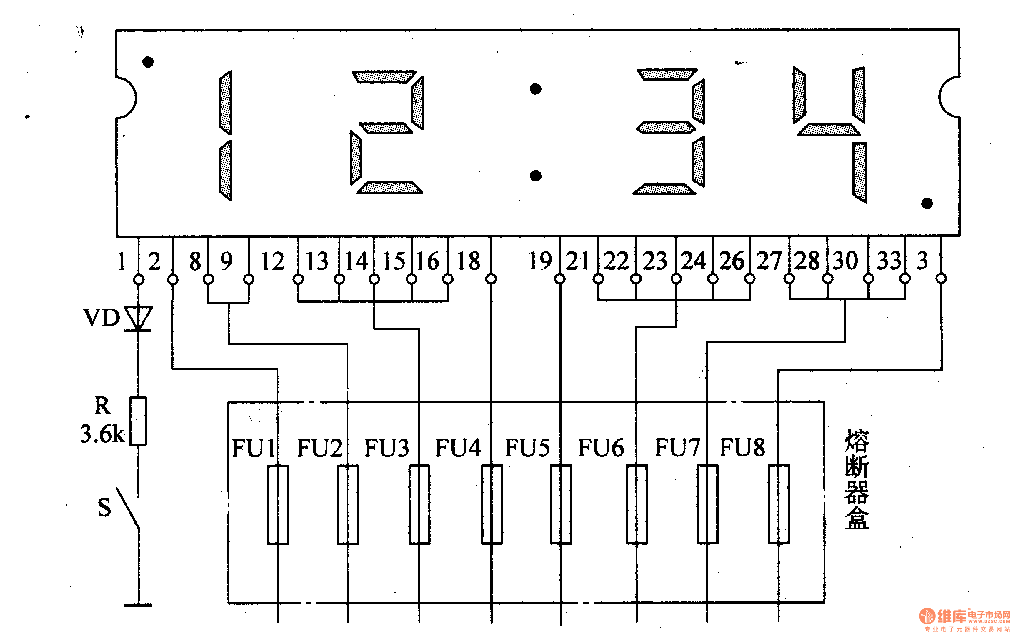 Here is to introduce a fuse box which utilizes the digital display to monitor and indicate the working state of the car fuse box, it characterizes direct display and convenient search.The working principle of the circuitThe fuse box indicator circuit consists of the digital display of integrated circuit type, diode VD, resistor R and power supply switch S, see as figure 7-45.