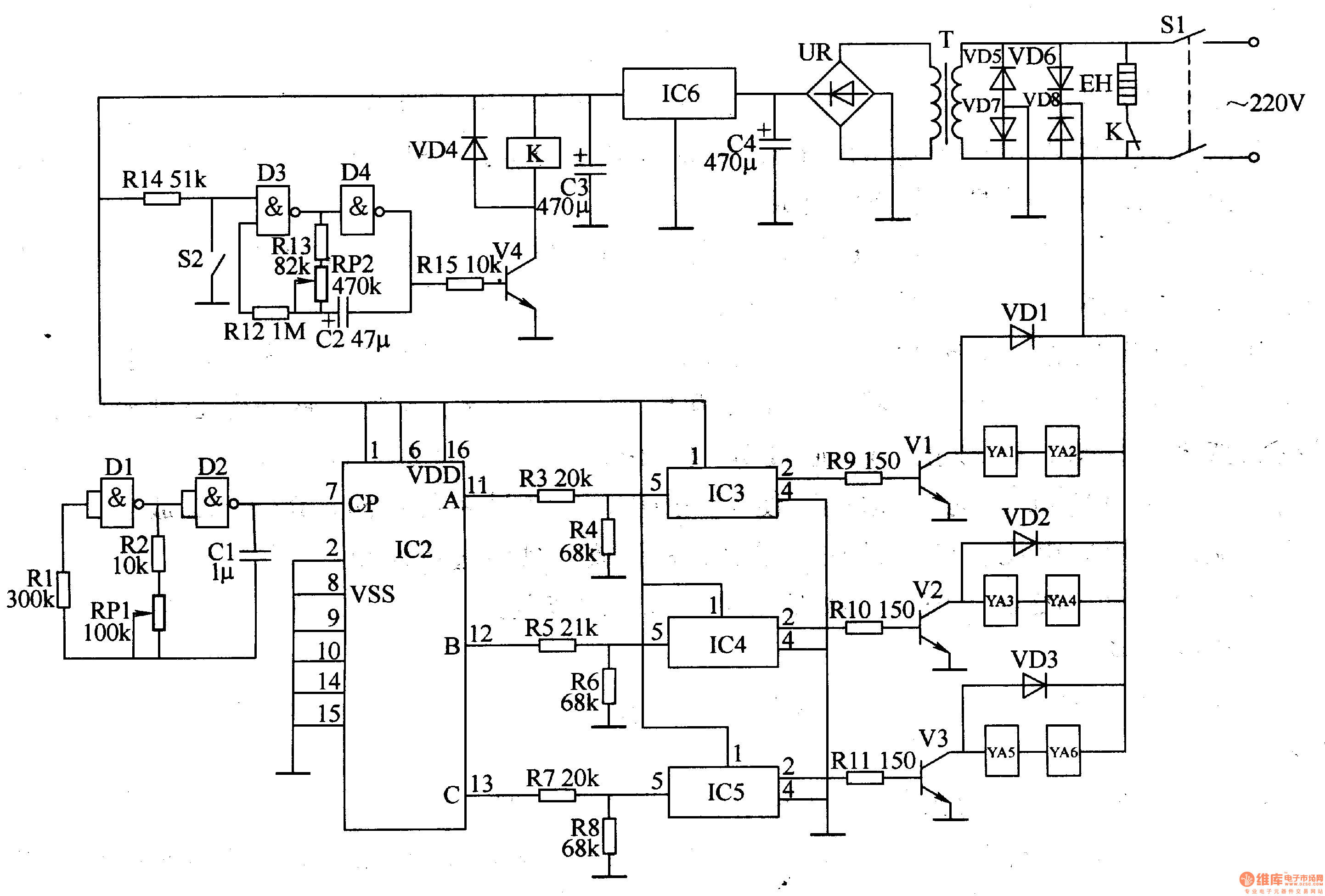 The power supply circuit consists of the power supply switch S1, power transformer T, rectifier bridge pile UR, 3-terminal regulated integrated circuit IC6, filter capacitors C3 and C4.