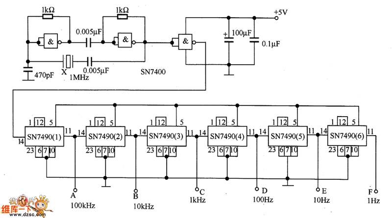 In the figure is the oscillating circuit composed of crystal and NOT gate. In the circuit, X is the 1MHz crystal, and it connects with 10 frequency splitting circuits, which has 6 stages of parallel connections. Therefore, it can pick out signals of different frequencies from different output terminals, i.e A terminal outputs 100KHz frequency, B outputs 10KHz, C outputs 1KHz, D outputs 100 Hz, E outputs 10Hz, F outputs 1Hz and so on.