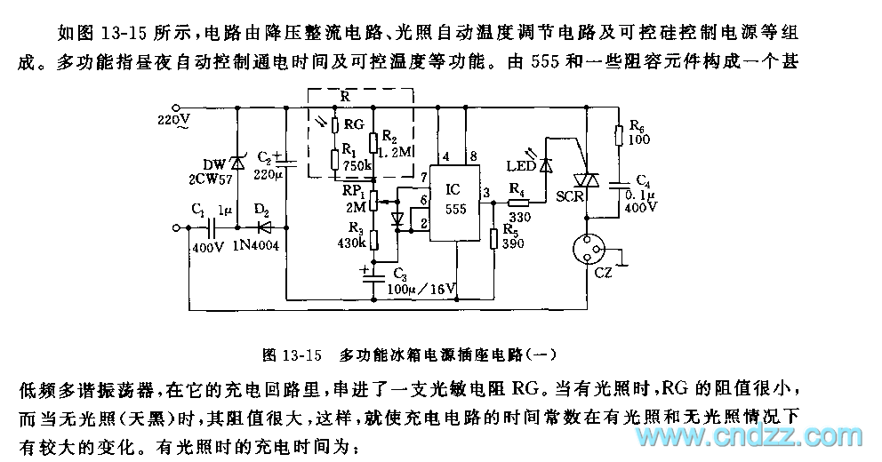 See as Figure 13-15, the circuit consists of the step-down rectifier circuit, lighting auto temperature adjusting circuit and controllable silicon control circuit, etc. The multi-function here means auto control of conducting time day and night, and controllable temperature, etc. 555 and some RC-components form a very low multi-resonate oscillator, in the oscillator circuit, a LDR is series connected. When there is light, the resistance of RG is very small; and when it dark outside, the resistance is very large, therefore, the time constant of the charging circuit changes a lot in the bright and dark environments.