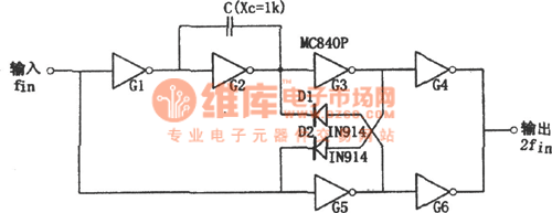In the figure is the rectangle pulse frequency doubler circuit. This circuit is a digital frequency doubler, which consists of a 6-inverting-phaser MC840P, 2 diodes and a capacitor, and its working frequency is 1Hz~100KHz. The input signal of the circuit is a square wave, and the output is an approximately symmetric rectangle wave. The required capacitive reactance of capacitor C at the frequency is 1kΩ. If the required output is a symmetric square wave, we can connect the capacitor with a resistor in serial or parallel way. The output circuit includes the phase inverters of G3, G4, G5 and G6, and they are coupled by the diodes of D1 and D2.