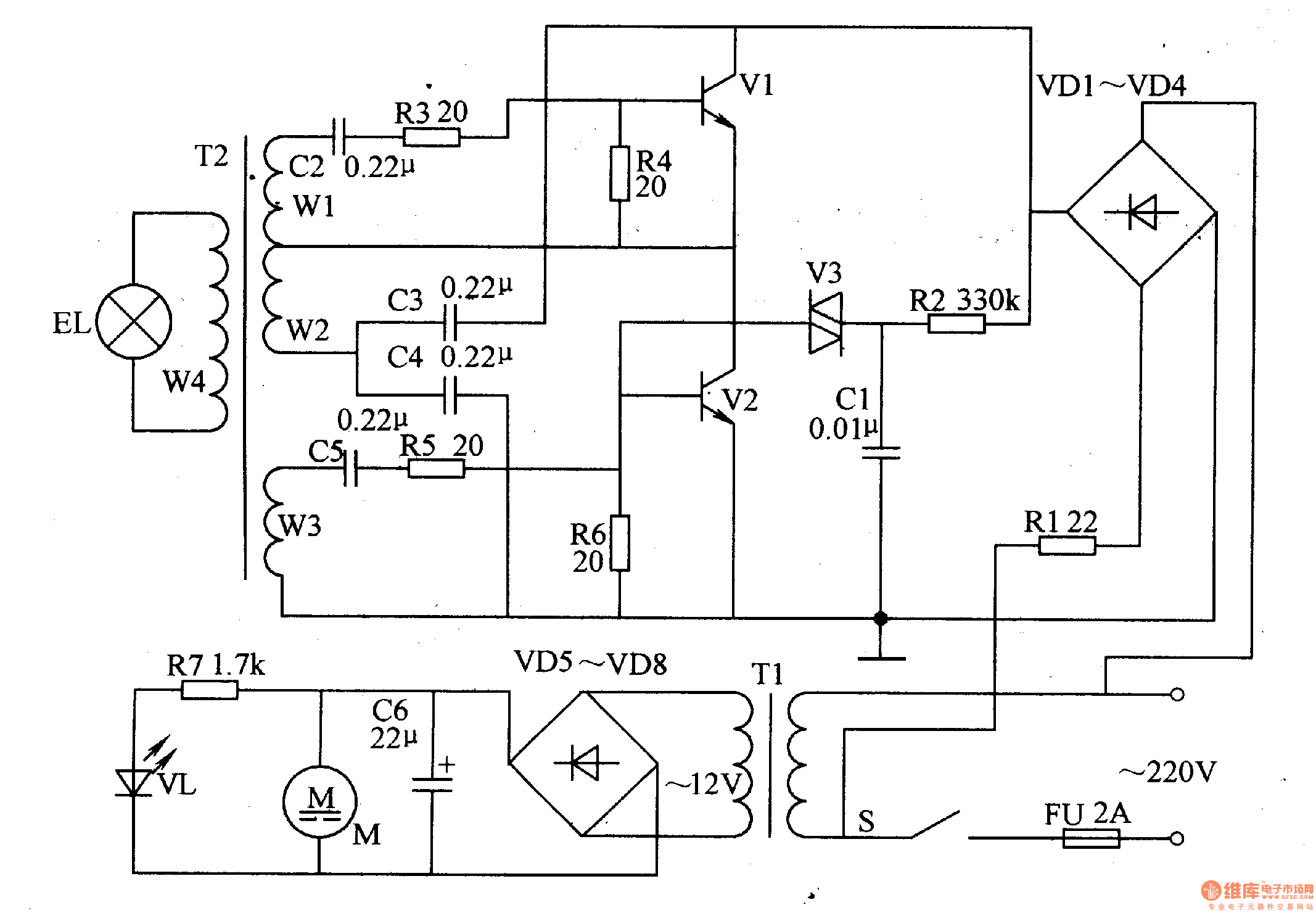 The power supply circuit consists of the fuse FU, power supply switch S, rectifier diode VD1-VD8, power supply transformer T1, filter capacitor C6, resistor R1 and R7, power supply indicating LED VL and fan motor M.