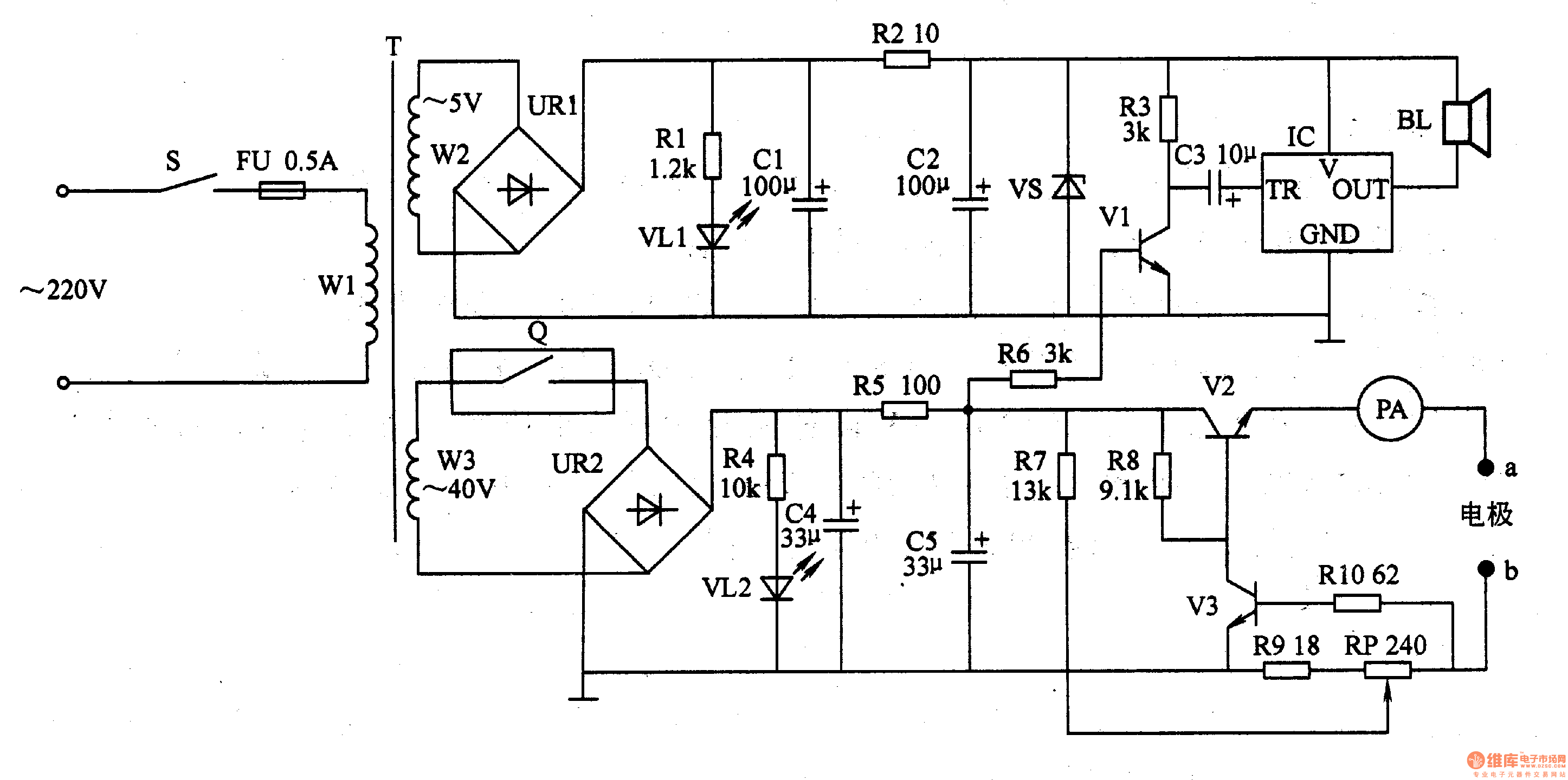 Constant current output circuit consists of Resistors R7-RlO, potentiometer RP, transistor V2, V3, PA meter and electrode a, b.