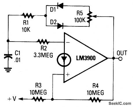 C1 alternately charges via R1/D1 and the upper half of R5, and discharges via R1/D2 and the lower half of R5. The duty cycle can be varied over the range from 1:10 to 10:1 via R5.