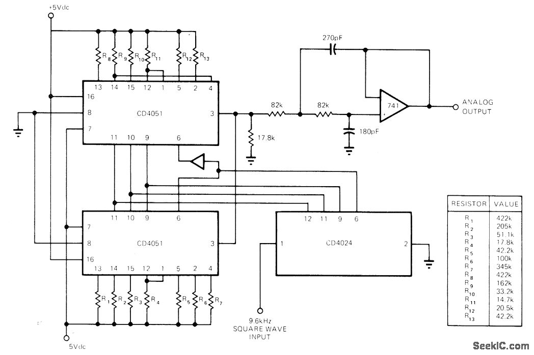 Values of weighting resistors connected to inputs of multiplexer chips determine waveform of analog output. CD4024 binary counter sequences multiplexers through all states at 16 times fundamental frequency of desired waveform. Active filter using 741 opamp removes components of sampling frequency. For near-approximation to sine wave, weighting resistors range from about 15Kto 425K.-J. R. Tracy, CMOS Circuits Generate Arbitrary Periodic Waveforms, EDN Magazine, Aug. 20, 1973, p 86-87.