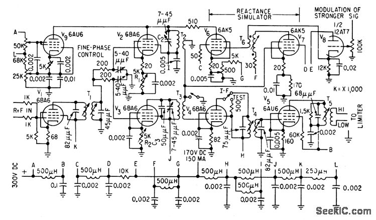 High-Q trap in reactance-tube circuit attenuates stronger of two signals, to permit capture of weaker of two cochannel f-m signals, as often required in police, military, and telemetering systems, Trap introduces depression in frequency re sponse of third i-f stage, centered on frequency of stronger signal.-E. J, Baghdady and G. J. Rubissow, Dynamic Trap Captures Weak F-M Signals, Electronics, 32:2, p 64-66.