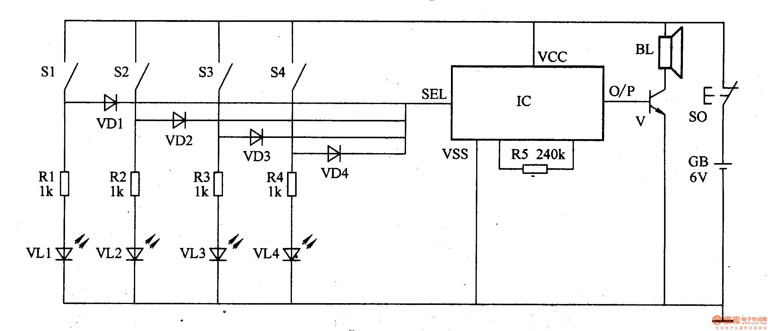When one of the call switches S1-S4 is pressed, the IC is triggered on to work, the music electrical signal output by O/P is amplified by V to drive BL to send out music