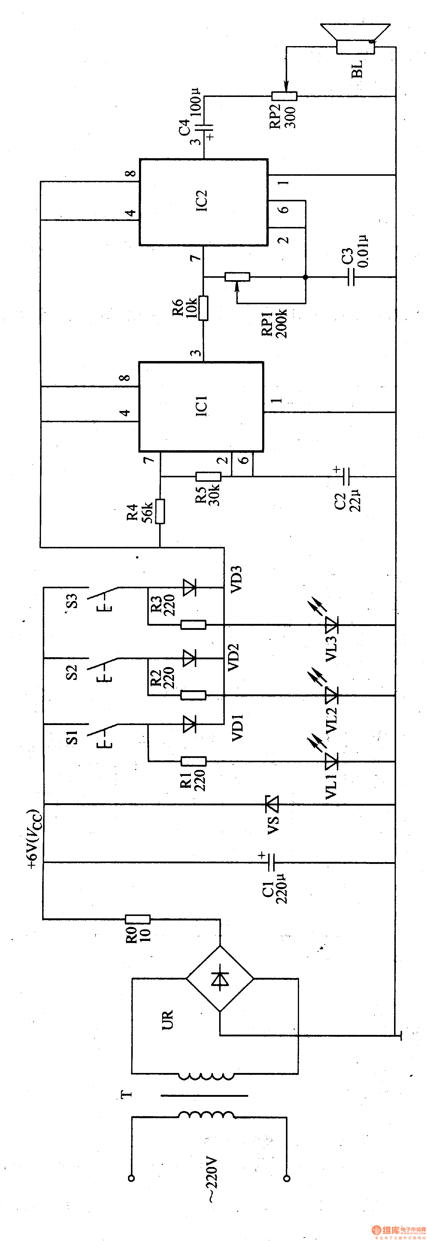 When the call buttons S1-S3 are not pressed, LED vl1-vl3 are all off. Oscillator A and B are both in the stop state lacking of work voltage, and the speaker BL is quiet.