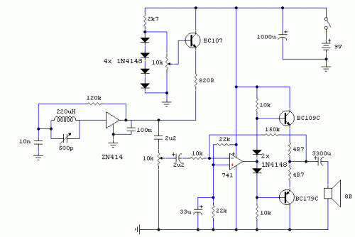 Notes:Designed around the popular ZN414 ic this receiver covers the AM band from 550 - 1600 KHz with the values shown. For Longwave the coil needs to be changed. Use one from an old MW radio to save time. The ZN414 is a tuned radio frequency designed and incorporates several RF stages and an AM detector. It is easily overloaded and the operating voltage is critical to achieve good results.The BC107 acts as a voltage follower, the four 1N4148 diodes providing a stable 2.4V supply. With the 10k pot , which acts as a selectivity control, and the b-e voltage drop of the BC107, the operating voltage for the ZN414 is variable from 0 to 1.8volts DC. If you live in an area that is permeated with strong radio signals, then the voltage will need to be decreased. I found optimum performance with a supply of around 1.2 volts.