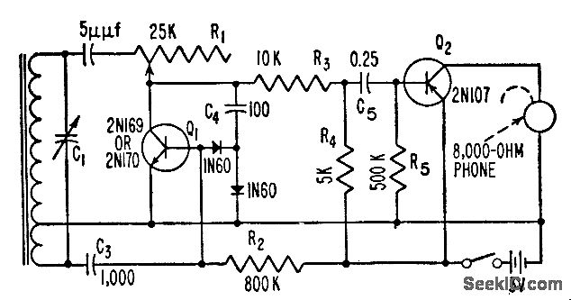 Q1 is used regeneratively as r-f amplifier and reflexively as first a-f amplifier, while Q2 serves as power amplifier.-S. A. Sullivan, Transistor Radio Uses Few Parts, Electronics, 31:1, p 90-92.