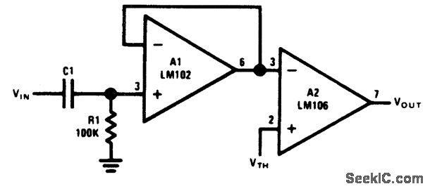 Fig. 15-10 This circuit also buffers the input of an LM106 with an L102 voltage follower. The LM106 draws an input current that is twice the specified bias current when the signal is above the comparison threshold. This asymmetrical current drain charges a coupling capacitor that is connected directly to the LM106 input and it can produce an error. The problem is eliminated with a buffer because the input current to the LM106 is both low and constant. National Semiconductor. Linear Applications Handbook 1991 p. 1190.
