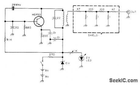 Single-transistor 28-MHz crystal oscillator and carefully designed attenuator network serve to generate signal of about 1μA for checking performance of amateur radio receiver, Can be used on any band down to 6 meters by appropriate choice of crystal and LC circuit components. Coil is CTC LS5 form having 15 turns No. 22 enamel and 2-turn link.-Is It the Band or My Receiver?, 73 Magazine, Oct. 1976, p 132-133. (View)
