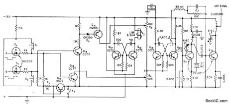 Eight transmitters, towed as group around ground antenna by airplane, hove frequencies spaced throughout bandwidth of antenna under test, from 2 to 50 Mc. Pulse-controlled ring counter switches transmitters up to 40 times per second. All transistors are type 2N3053.-C. Barnes, Transmitters Towed Through Air Test Antenna's Radiation Pattern, Electronics, 38:21, p 96-101.