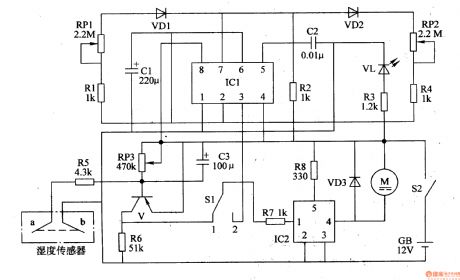 Work of the circuit The circuit consists of humidity examining circuit, electric switch control circuit and Multivibrator (It is showed in the picture 7-166.). Humidity examining circuit consists of humidity sensors, transistors v, resistors R5, R6, potentiometer RP3and capacitor C3. Electric switch control circuit consists of electronic switch integrated circuit IC2, function switch Sl, resistors R7, R8 and diode VD3. Multivibrator consists of time-base integrated circuit ICl, resistors Rl, R2, R4, potentiometer RPl, RP2, capacitor Cl, C2 and diode VDl, VD2. When the switch is off the motor is out of work. When it is rainy the electric switch within IC2 is turned on and M starts to work. When the rain is over the electric switch within IC2 is turned off. And M stops working. S2 is the power switch so you should turn it off when the car is not moving.   (View)