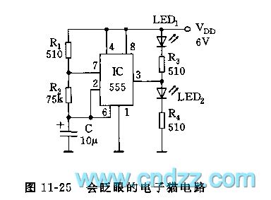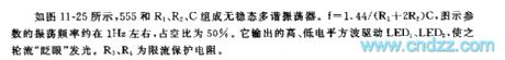 As shown on the figure 11-25, the astable multivibrator consists of the 555 and R1 and R2 and C. f=1.44/(R1 +2R2)C, the oscillation frequency on the figure is about 1Hz, the duty ratio is 50%. The high power level which outputs drives LED1 and the low power drives the LED2 drives the LED2. The LED1 and LED2 can light in turn. The R3 and R4 are Current-limiting protective resistances.   (View)