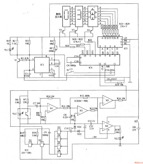 Work of the circuit The circuit consists of infrared testing amplifying circuit, negative voltage producing circuit, working indicating circuit, timing circuit and digit displaying driving circuit. (It is showed in picture 9-54.) Infrared testing amplifying circuit consists of infrared optocoupler (infrared sensor) VLC, resistors R6-Rl5, capacitors C7, C8, and Nl-N3 within the operational amplifier integrated circuit lC2 (Nl-N4). Negative voltage producing circuit consists of six non-gate integrated circuit IC3 (Dl-D6), resistors Rl6, R17, capacitor Cg-C11 and diode VDl, VD2. Working indicating circuit consists of capacitor Cll, IC2 internal op amp N4, resistors R18 and power indicator LED VL2. Timing circuit consists of time-base integrated circuit rCl, resistors R1-R5, potentiometer RP, capacitors Cl-C3, light-emitting diodes VLl and transistors Vl. Digit displaying driving circuit consists of digital displays, transistors V2-V4, resistors R2O-R29, capacitors C4-C6, counter display driver integrated circuit IC4and decoding circuit IC5. Turn on power switch S2 and the battery GB will provide +l2V working voltage to ICl-IC5. Oscillating signal is shaped and rectified. It then provides -9V voltage to IC2. When you do the test put your finger on the reflexing window of VLC. Infrared signal goes through the soft tissue and reflexes on phalanx. The infrared photosensitive transistor receives the signal and turns it into electronic signals. The digital displayer starts working and N4 drives VL2 flash. After the regular time (30s) is over, the counter stops working. Double of the figure on the displayer is the tester’s heart rhythm.   (View)