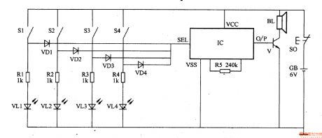 This ward caller is consists of calling-control circuit and music circuit. Aalling-control circuit consists of callswitchesSl-S4,resistorsR1-R4,light-emitting diodesVLl-VL4anddiodeVDl-VD4. Music circuit consists of resistorR5,transistorV,musicintegrated circuitIC andspeaker BL . When one of the call switches S1-S4 is pressed, the IC is triggered on to work, the music electrical signal output by O/P is amplified by V to drive BL to send out music sound; at the same time the LED in this branch is on to indicate the bed number of the patient. After the medical personnel receives the acousto-optic calling signal, they reset S2 and press the reset button S0 to make IC reset and BL stops. Only four calling circuitsare showed in the figure and the number of it can be adjusted according to actual need.   (View)