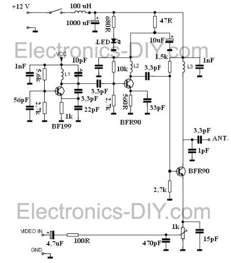 This is a TV transmitter for transmitting video of various video sources such as video cameras, Satellite receivers, DVD players, game consoles, etc. TV transmitter's circuit is working on the 470-580 MHz frequency and can be received on UHF channels 21-34. TV Video transmitter can radiate as far as 300 meters by using a 10-20 cm wire antenna. TV transmitter requires voltage of 9-15 Volts. However, you can also use a 9v batteries. Oscillator is based around BF199 and BFR90 RF transistors. If needed the range of TV transmitter can be extended by replacing BFR90 with 2N3886 transistors. (View)