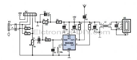 Here is a simple USB FM transmitter that could be used to play audio files from an MP3 player or computer on a standard VHF FM radio by connecting it to an USB port. The circuit use no coils that have to be wound. This USB transmitter can be used to listen to your own music throughout your home. To keep the fm transmitter circuit simple as well as compact, it was decided to use a chip made by Maxim Integrated Products, the MAX2606. This IC from the MAX2605-MAX2609 series has been specifically designed for low-noise RF applications with a fixed frequency. The VCO (Voltage Controlled Oscillator) in this IC uses a Colpitts oscillator circuit. The variable-capacitance (varicap) diode and feedback capacitors for the tuning have also been integrated on this chip, so that you only need an external inductor to fix the central oscillator frequency. (View)