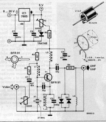 Simple oscillator that generates a frequency in the VHF or UHF region. The oscillator is modulated with the video signal and the modulated carrier wave thus generated is fed into the TV set's aerial input via a cable. Then all that remains to do is tune the TV to the correct frequency. (View)