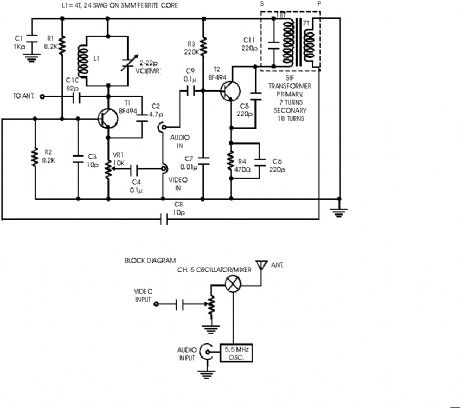 The transistor of the video transmitter can be a BC108, BC546, BC337 or a 2N2222. L1 is wound on a 10 mm air former. Use 6 turns 24 SWG for frequency 60-80 MHz, 4 turns for 150-180 MHz, and 2 turns for 180-200 MHz You can use this with a monochrome or color video signal. To transmit sound just build the wide band FM transmitter and tune it to the audio channel.