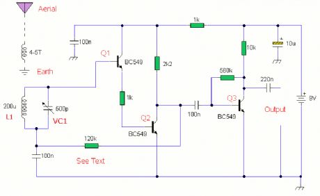 This is a compact three transistor, TRF receiver with fixed feedback. It is similar in principle to the ZN414 which is now replaced by the MK484. The design is simple and sensitivity and selectivity of the receiver are good. (View)