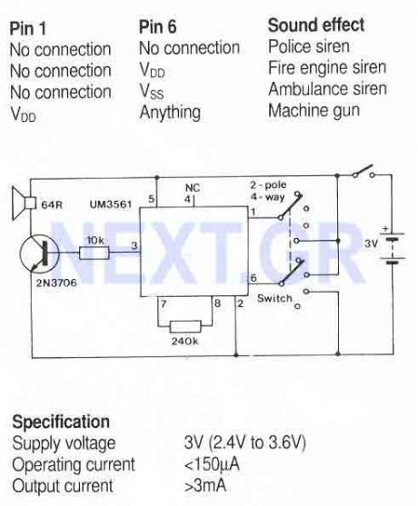 A simple sound generator IC that can produce four sound effects. Designed for use in toys, the effects are selected by varying the connections to pins1 and 6 as follows... (View)