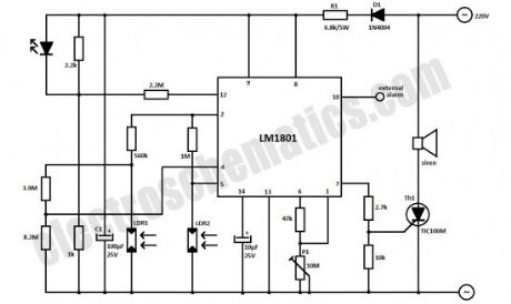 This photoelectric smoke detector circuit uses one LED and 2 LDRs to detect the smoke and sound an alarm. The LM1801 IC is the best choice for this circuit because we need a few external components and is used in almost any smoke alarm.