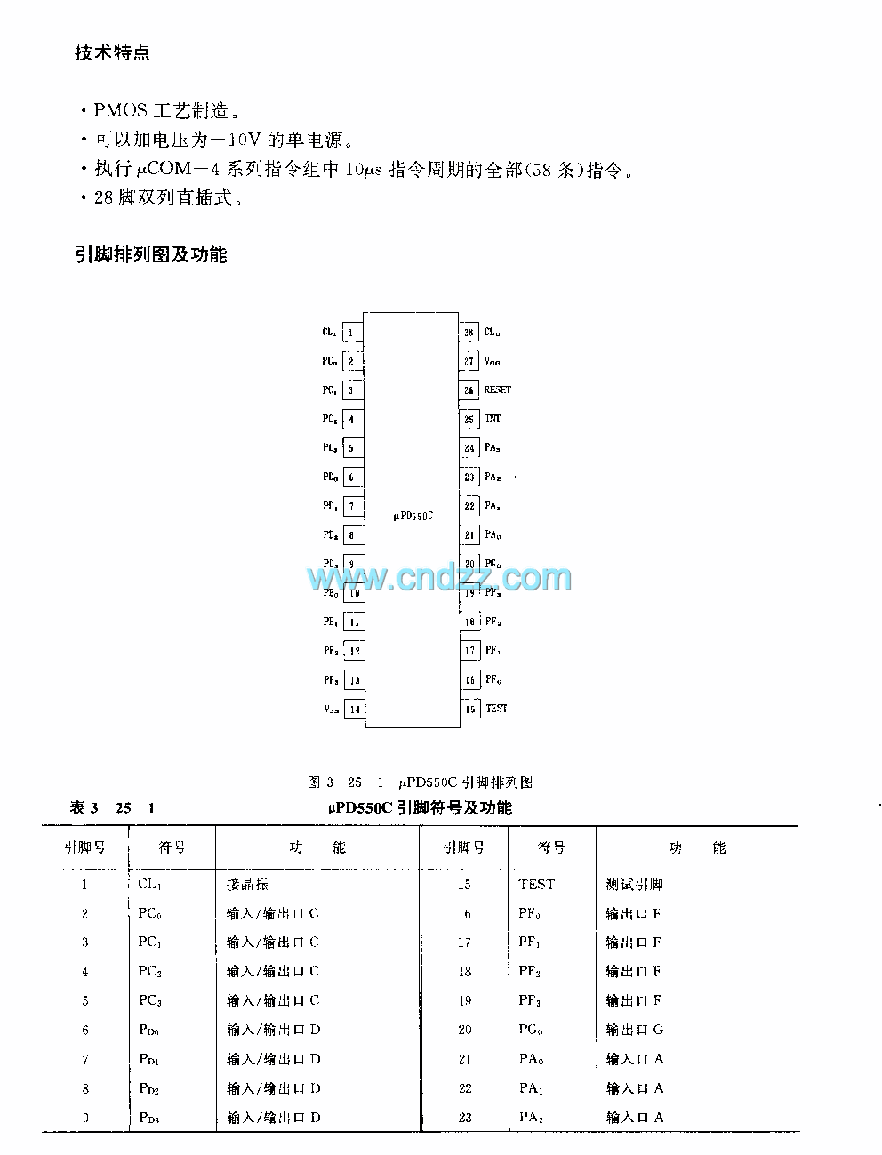 μPD550C is a 4-bit singlechip microprocessor applied to TV infrared remote control receiver system. Internal circuit includes 640×8bit real only memory(ROM), 32×4bit random access memory(RAM),a testable interrupt input INT and a single level stack. The function is encoding code signal sent by preamplifier and controlling related circuits.