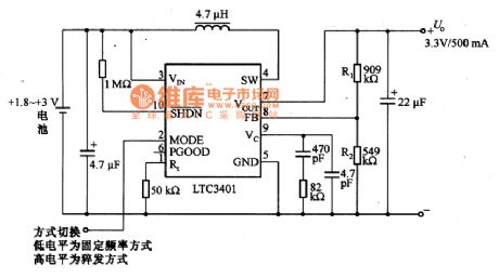 Boost converter circuit is composed of LTC3401. LTC3401 is a circuit which has all the functions needed by boost power supply. it can start to work with 1V input voltage. It costs a low current with38μA. Input voltage range is 1 ~ 5V, output voltage is set in 2.6 ~ 5Vby R1 and R2. LTC3401 uses 2-pin mode switching terminal. The control signal can be applied. When the control signal is low, LTC3401 works for the fixed frequency. Ituses burst working mode when the level is high. (View)