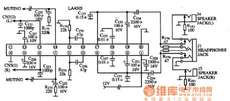 The typical application circuit of LA4505 IC is shown as the chart, the left and right audio signalsare input from the foot and pin ⑧ of LA4505 and it is amplified and output from ④ feet to drive the speaker power, and the power can reach ten 8W +8W (RL30).