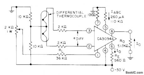 Conversion from differential input signal of thermocouple to single-ended output signal is achieved without feedback by using CA3094A programmable opamp. Output is ±4.7 V at 8.35 mA. Preamp gain is 180. For linear operation, differential input must be equal to or less than ±26 mV,- Circuit Ideas for RCA Linear ICs, RCA Solid State Division, Somerville, NJ, 1977, p 13. (View)