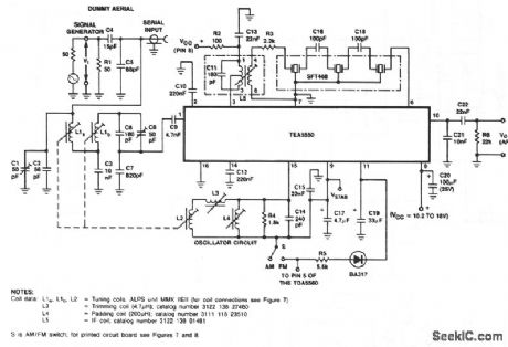 This circuit diagram is for a double-tuned, AM-channel, in-car radio receiver using the TEA5550. (View)