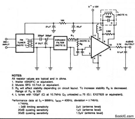 The LM384 processes signals with respect to earth so that an asymmetnc supply is sufficient.Theamplification has been set internally to×50(34 dB),The IC’s supply line is decoupled by C9.