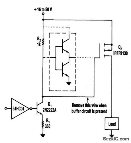 This circuit operates from a 16-to 50-V supply.Adding the buffer circuit(within the dashed lines)offers 100-ns switching times,Otherwise,the circuit switches in 1μs