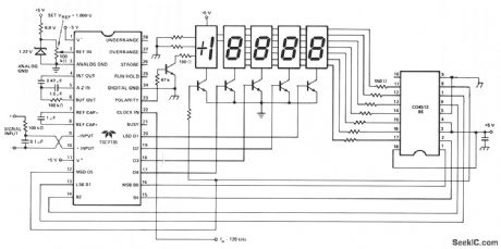 Here, a Teledyne TSC7135 DVM chip is used to drive a multiplexed 5-digit display. A CD4513BE CMOS IC, for common cathode drive, is used as a segment driver selected by pins 17-20 of the DVM chip. The transistors can be any suitable npn type such as 2N3904, etc. (View)
