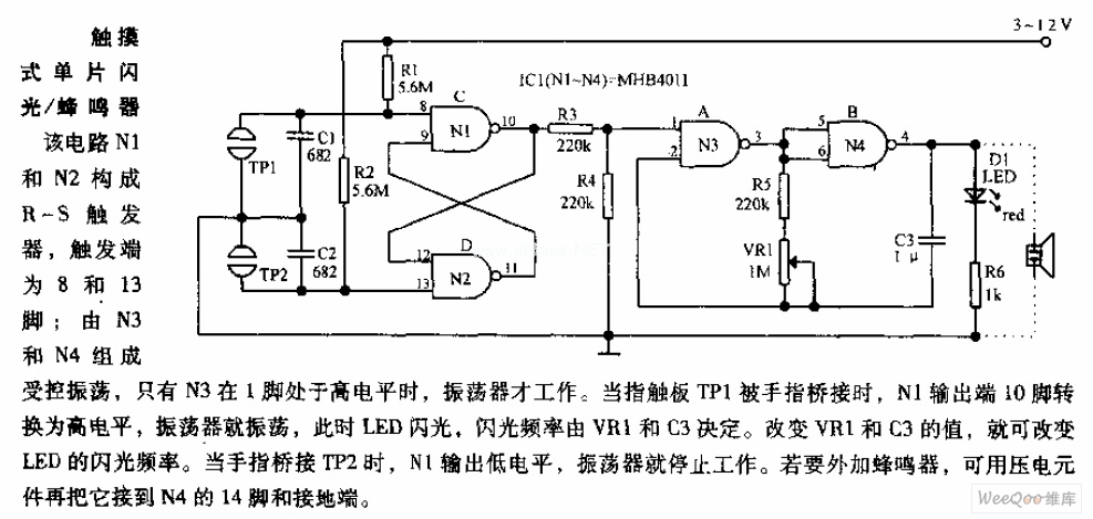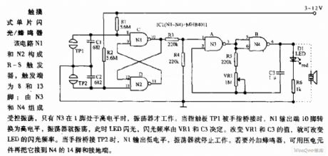 In the circuit, N1, N2 constitute the RS flip-flop, and the trigger end is pin 8 and 13; N3, N4 form the controlled oscillator, only when N3's pin 1 is high, the oscillator works. When the finger touching pad TP1 is bridging, N1 output's pin 10 turns to high level, the oscillator will oscillate, then the LED flashes, and the flash frequency is determined by the VR1 and C3. Changing the value of VR1 and C3, we can change the LED flashing frequency. When the finger is bridged to TP2, N1 output is low, the oscillator will stop working. If needs the external buzzer, then you can connect it to N4's pin 14 and the ground by piezoelectric components.