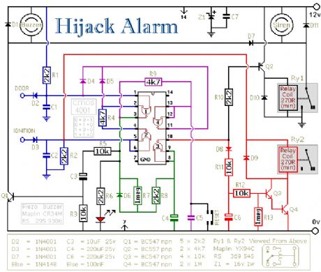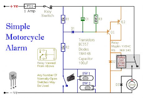Any number of normally open switches may be used. Fit the mercury switches so that they close when the steering is moved or when the bike is lifted off its side-stand or pushed forward off its centre-stand. Use micro-switches to protect removable panels and the lids of panniers etc. While at least one switch remains closed, the siren will sound. About two minutes after the switches have been opened again, the alarm will reset. How long it takes to switch off depends on the characteristics of the actual components used. But, up to a point, you can adjust the time to suit your requirements by changing the value of C1.The circuit board and switches must be protected from the elements. Dampness or condensation will cause malfunction. Without its terminal blocks, the board is small. Ideally, you should try to find a siren with enough spare space inside to accommodate it. Fit a 1-amp in-line fuse close to the power source. This protects the wiring. Instead of using a key-switch you can use a hidden switch; or you could use the normally closed contacts of a small relay. Wire the relay coil so that it is energized while the ignition is on. Then every time you turn the ignition off, the alarm will set itself.When it's not sounding, the circuit uses virtually no current. This should make it useful in other circumstances. For example, powered by dry batteries and with the relay and siren voltages to suit, it could be fitted inside a computer or anything else that's in danger of being picked up and carried away. The low standby current and automatic reset means that for this sort of application an external on/off switch may not be necessary. (View)