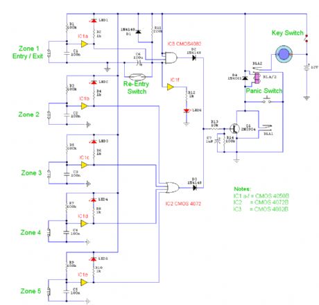 This is a complete alarm system with 5 independent zones suitable for a small office or home environment. It uses just 3 CMOS IC's and features a timed entry / exit zone, 4 immediate zones and a panic button. There are indicators for each zone a system armed indicator.