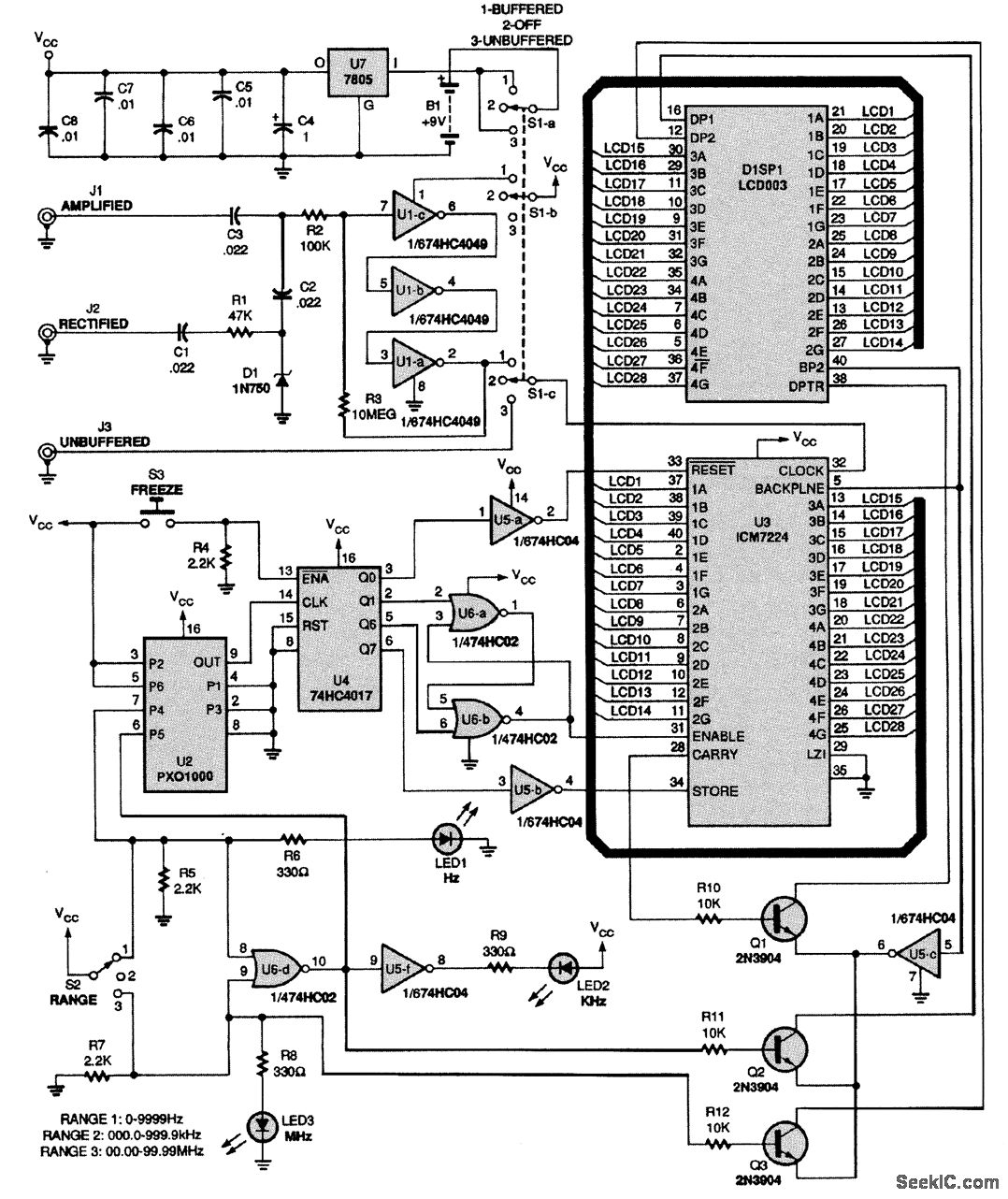 An Intersil ICM7224 is used to drive an LCD003 four-digit LCD display unit. Three inputs are provided, which add signal conditioning, either gain, rectification, or unbuffered input. A Statek PXO-1000 1-MHz clock is used as a frequency reference. S2 selects gate time and hence range, with LED1, LED2, and LED3, indicating Hz, kHz, or MHz, respectively.
