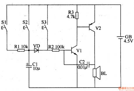 The three-tone electronic doorbell circuit consists of buttons Sl-S3, transistors Vl, V2, speaker BL, resistors Rl-R3, capacitors Cl, C2, diode VD and battery GB, and it is shown in Figure 3-109. Rl-R3 use the 1/4W carbon film resistors or metal film resistors. Cl uses the electrolytic capacitor with voltage in 16V; C2 uses the monolithic capacitors or polyester capacitors. VD uses the 2AP9 germanium ordinary diode or 1N4148 silicon switching diode. Vl uses the 3DG6 or S9013 silicon NPN transistor; V2 uses the 3AX31 germanium PNP transistor.