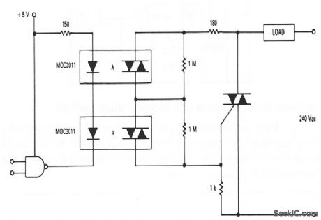This circuit shows two MOC3011 optoisolators used to drive a 240-V triac-controlled load-even though the individual MOC3011 voltage rating is not sufficiently high to be used directly on a 240-V line. The two 1-MΩ resistors equalize the voltage on the MOC3011s. (View)