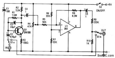 It seems that guitar fuzz boxes have been around since the beginning of rock, and have seen little improvement over the years. This one is somewhat different because rather than simply distorting the sound, it also pulses in step with the peaks of the waveform from the pickup because of the Schmitt trigger op amp circuit. Capacitor C2 requires some explanation. It should normally be a 1- or 2-μF electrolytic capacitor. However, we show the value as 470 pF because it's recommended as an experimental value giving fgr out effects.